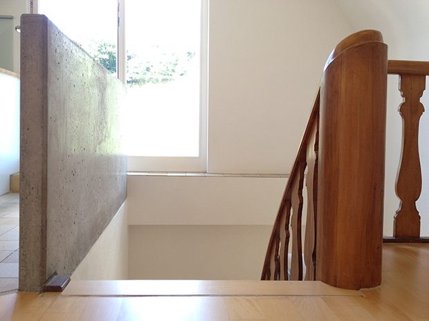 Der auf den unteren Stock erweiterte Wohnungseingang kristallisiert dieses Konzept bereits heraus. Das alte Treppengeländer wurde beibehalten, dem gegenüber eine moderne Brüstung aus Sichtbeton gesetzt, die Neues und Altes in ein interessantes Spannungsverhältnis setzt. Das Treppenhaus erhält durch den Einbau einer Glastür weiterhin das gewünschte Licht. Der Eingangsbereich fließt in Küche und Essbereich über und differenziert seine Funktionen rein über den Bodenbelag. Die lichtdurchfluteten Zimmer ordnen mühelos teilweise nur mit eingestellten Wänden oder Einbauten den Raum. In denen sich z.B. auf engstem Platz dennoch ein Bad mit Wanne befindet. Mit der Verlagerung der Dachflächenfenster in die Außenhaut wurde zusätzliche Raumhöhe erschlossen. Der Raumeindruck wurde durch entfernen des Kniestocks und öffnen des Dachspitzes erweitert. Die freigelegten Holzgebälke geben den Räumen den klassischen Dachstuhl-Charakter. Die Nische welche durch den Kamin entsteht wird durch einen Einbauschrank optimal nutzbar. Der von hieraus zugängliche Balkon wirkt mit sein schlanken Stahlprofilen und davor angebrachten Absturzsicherungen aus durchsichtigem Glas angenehm leicht und schwebt über den Dächern der Nachbarschaft.